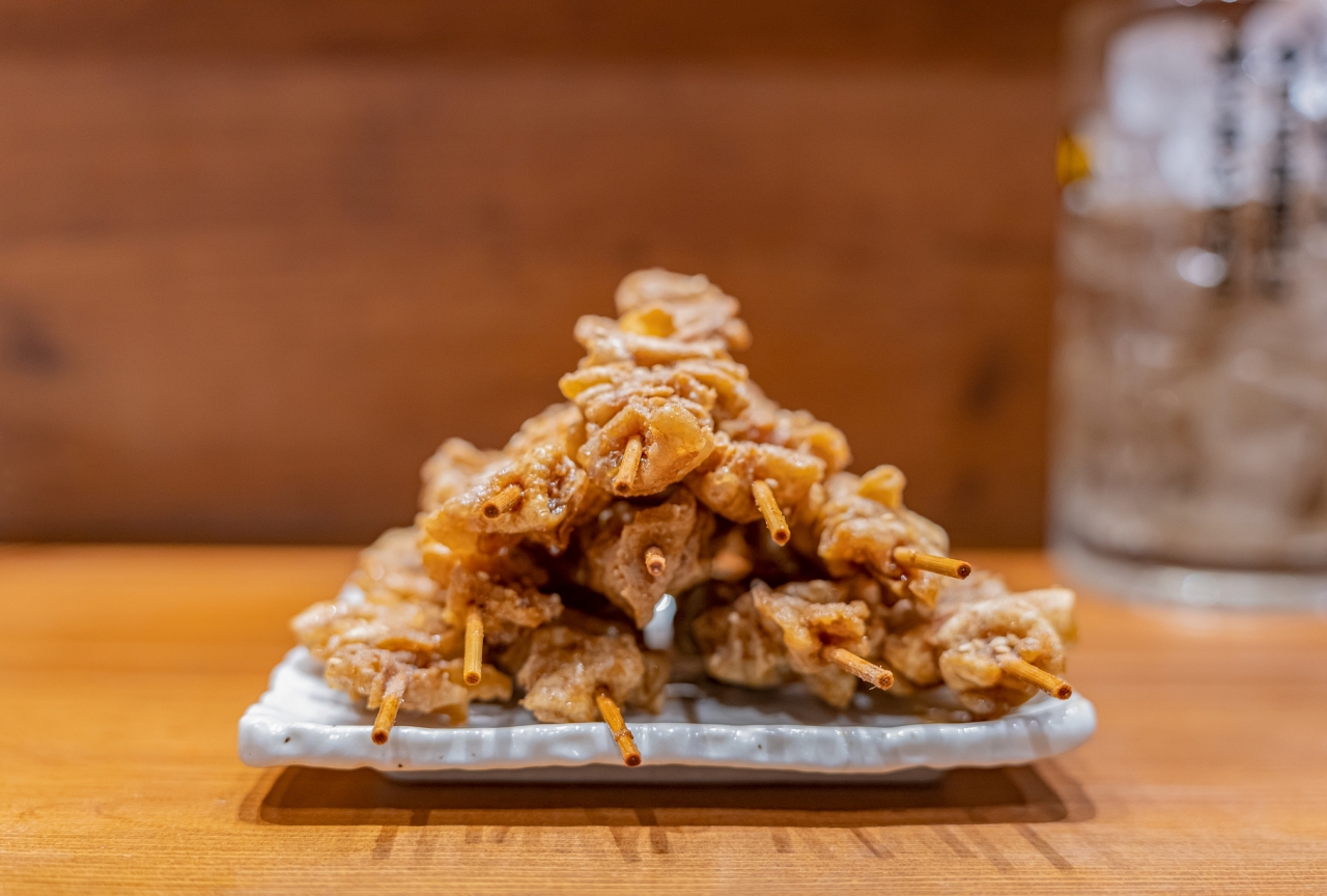 닭 껍질을 물결 모양의 꼬챙이로 만들어 기름에 튀기고 여분의 기름기를 제거하여 콜라겐만 남겼습니다. 식감이 겉은 굉장히 바삭하고 안은 촉촉해서 술안주로 절묘합니다. 양념에는 한국 고려인삼을 배합하고 향신료는 주성분이 콩이고 도저히 이해가 안 되지만 염분은 제로입니다. 덴쿠시는 조리 방법도 특허를 취득했으며 모방은 법으로 금지되어 있습니다. 신지다이에는 덴쿠시를 피라미드 모양으로 쌓아 올려 제공하는데 사진을 찍으면 맛있게 보입니다.