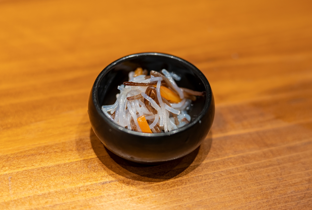 자리를 앉으니 오토오시가 나옵니다. 오토시는 300엔. 비싸지도 저렴하지도 않은 일본 이자카야에서 흔히 만날 수 있는 가격입니다. 오토오시는 일본의 이자카야(술집)에서 술을 시키면 주문하지 않아도 나오는 간단한 안주를 말합니다. 주문한 요리가 나오기 전에 간단히 술안주로 나오는 음식입니다. 오토오시는 일종의 자릿세로 생각하면 되고, 계산할 때 식사 대금과 함께 안주 요금이 청구됩니다. 오토오시의 가격은 가게마다 다르지만 보통 300엔에서 500엔 정도입니다.
