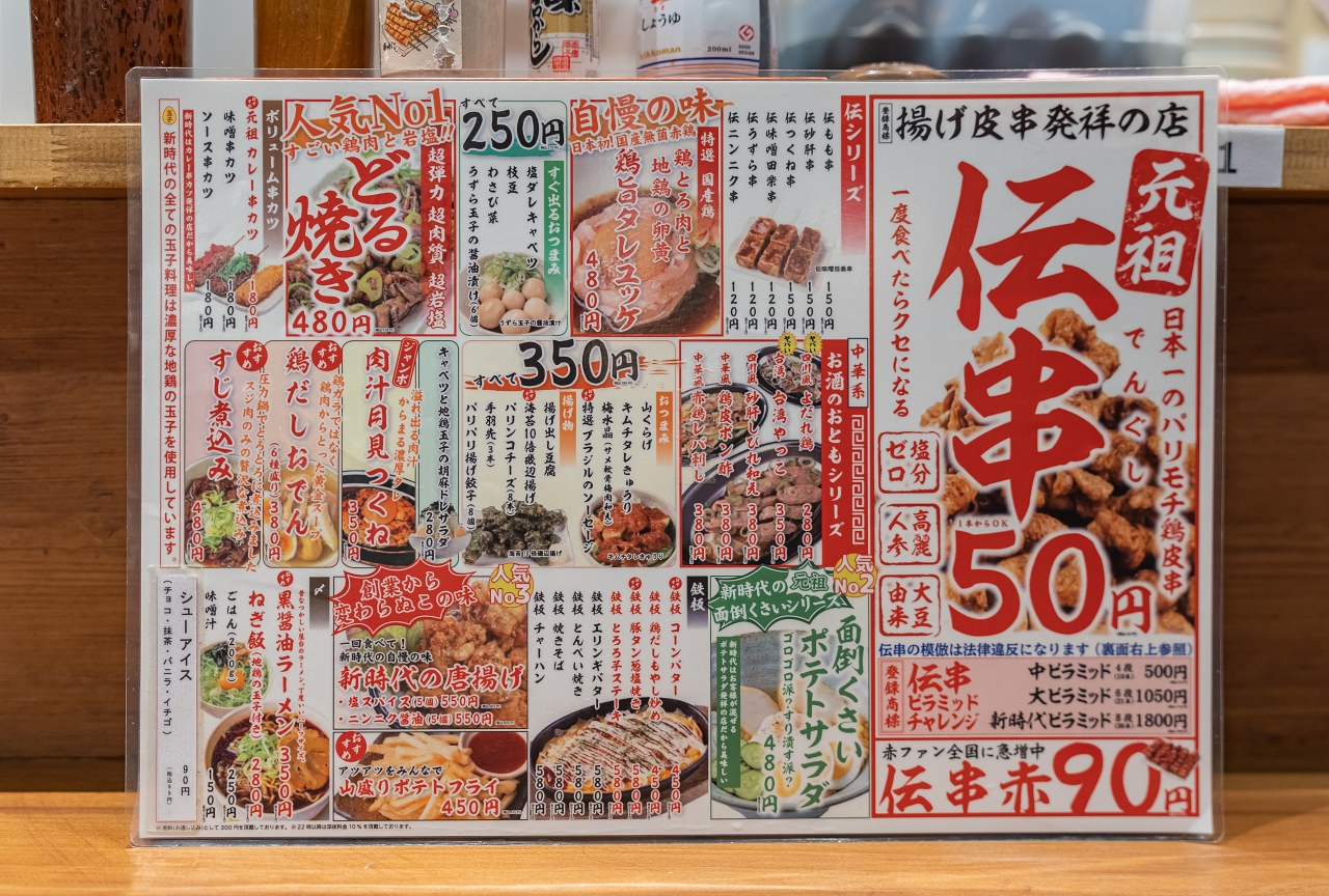 덴쿠시는 콩과 고려인삼을 사용한 양념으로 맛을 낸 것으로, 술안주로 인기가 있습니다. 테이크아웃도 가능하며, 가격은 매우 저렴합니다 전 점포에서 누계 판매 개수는 9000만 개. 일본 제일의 바삭바삭 닭껍질 꼬치를 주장하고 있습니다.