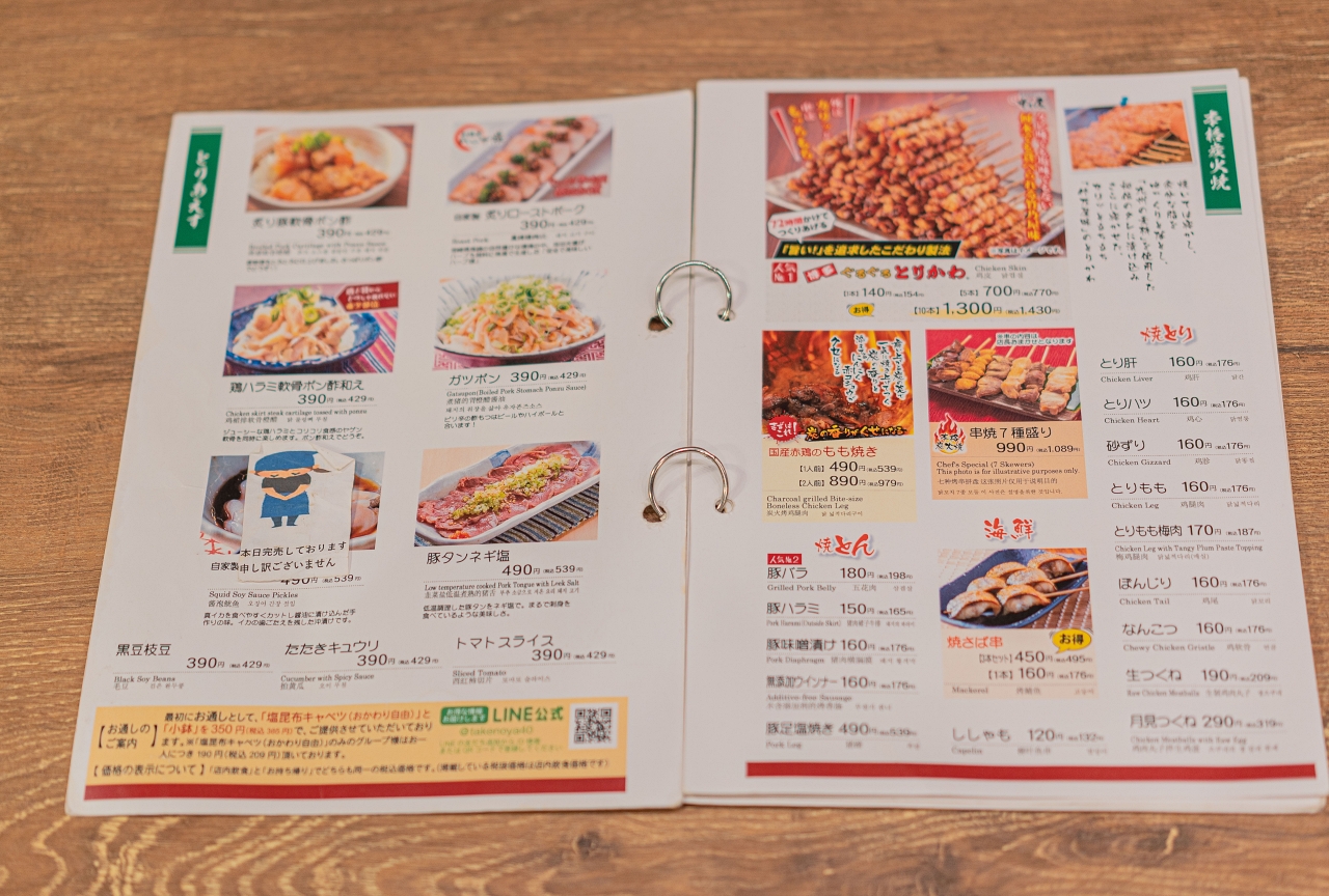 시작은 역시 토리카와 입니다. 후쿠오카 하카타의 명물 토리카와를 굽고 소스에 절인 뒤, 양념을 바르고를 반복해 천천히 지방을 떨어뜨리고 소스를 스며들게 하여 표면은 바삭하고 안은 쫄깃한 명물 토리카와를 완성시킵니다. 토리카와의 처리에 걸리는 시간은 72시간으로 72시간에 걸쳐 준비한 닭 껍질을 마무리로 구워 내서 완성시킵니다. 마무리된 토리카와에는 양념이나 소금을 추가하지는 않습니다. 시간을 들여 만든 토리카와의 맛은 지역 주민들에게도 관광객에도 인기가 많습니다. 타케노야의 하카타 구루구루 도리카와(博多ぐるぐるとりかわ)는 월간 80만 개 이상의 토리카와를 판매하고 있습니다.