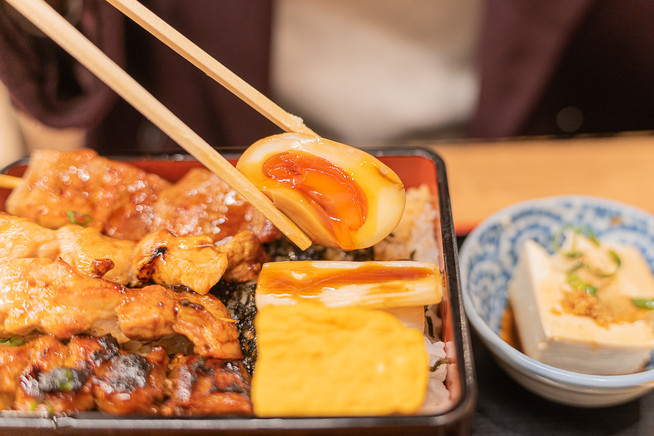 너무 맛있어 보이는 야키토리쥬. 야키토리쥬는 닭꼬치를 밥 위에 얹은 덮밥입니다. 일본 각지에서 먹을 수 있지만, 닭이 유명한 후쿠오카가 특히 유명합니다. 닭꼬치 덮밥은 닭고기 부위와 양념, 밥의 양 등에 따라 다양한 종류가 있습니다. 고소하고 육즙이 풍부한 닭꼬치와 밥의 궁합은 뛰어나고 가성비도 높은 인기 메뉴입니다.