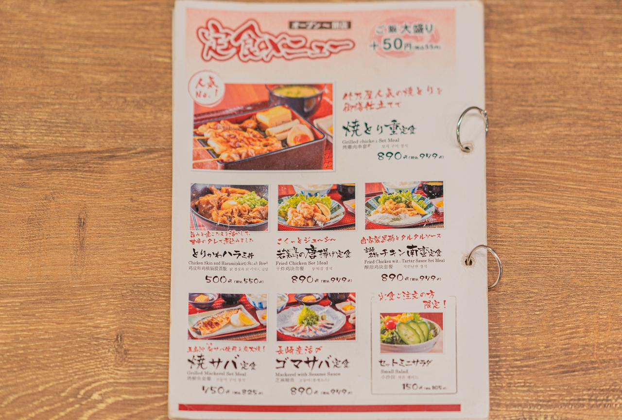 이번에 주문한 메뉴는 야키토리쥬 테이쇼쿠(焼き鳥重定食) 979엔과 구루구루 토리카와 쿠시(ぐるぐるとり皮串) 3개 (각 154엔) 입니다. 가격대비 양도 훌륭하고 사진 찍기에도 좋은 메뉴입니다. 딱 먹고 싶은 메뉴들로 구성 되어 있습니다.