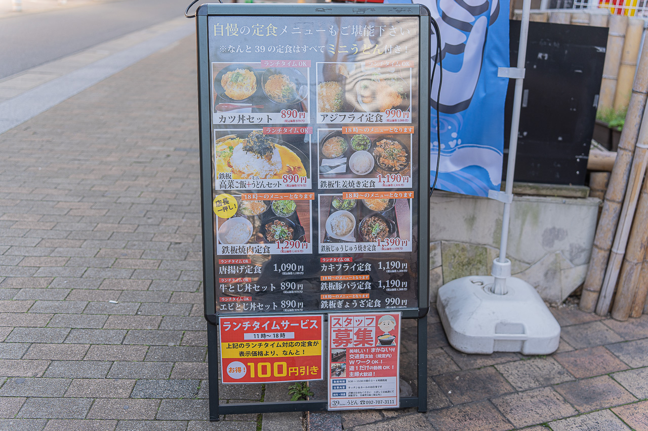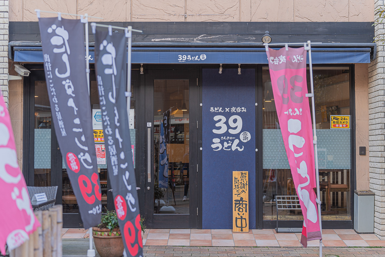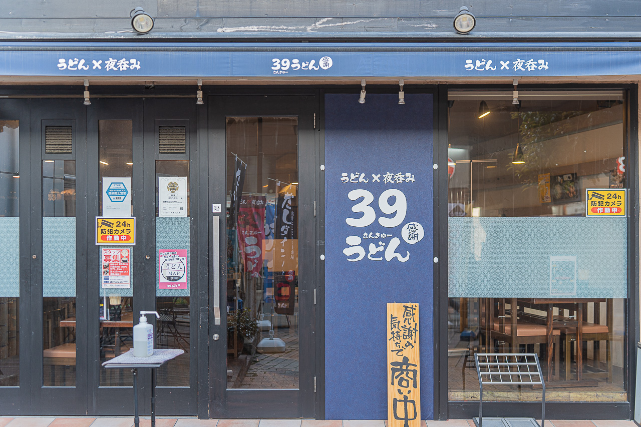 오늘 들린 우동 가게는 니시테츠 후쿠오카 텐진역에서 도보 4분, 역 앞에 가게가 있는 역전 우동인 39 우동입니다. 일본어로 하면 산큐우동이라 "땡큐 우동"이라고 불립니다. 지갑사정이 두둑하지 않은 직장인들에게 고맙게도 390엔에 우동을 제공하고 있고 이마이즈미나 텐진에서 가깝고 가성비가 좋아 점심때는 직장인들이 자주 찾습니다. 저녁에는 우동 이자카야로도 바뀌어 술과 우동이라는 굉장한 조합을 제공한다고 합니다.