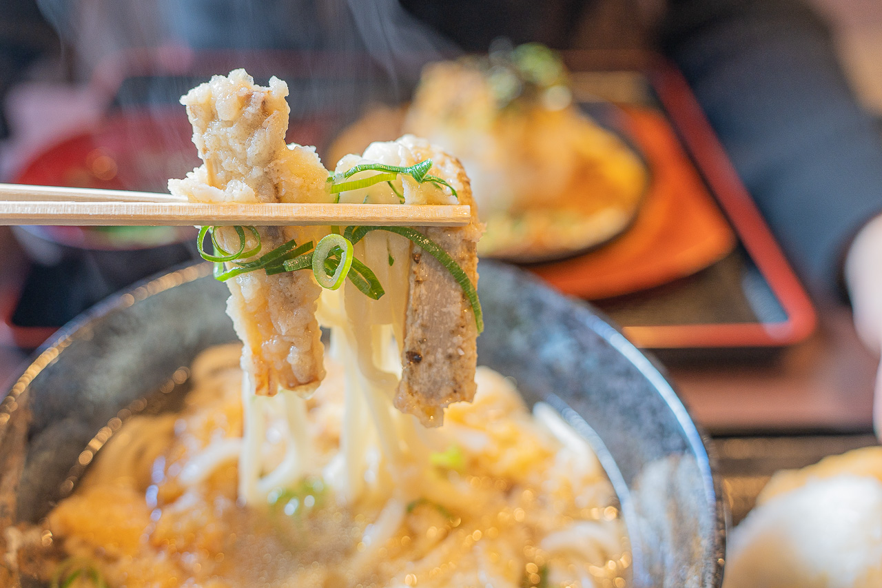 메인이 되는 우동 한 그릇. 후쿠오카에서 가장 좋아한다는 "고보텐(ゴボ天) 우동" 입니다. 위에 튀김은 우엉입니다. 튀긴 우엉은 부드러우면서도 쌉쌀한 맛이 포인트인데 후쿠오카에서 우동을 먹을 때 가장 즐겨 먹는 토핑입니다. 면발은 부드러워서 씹는 맛은 좀 없지만 목 넘김이 부드러워서 부드러운 우동을 좋아하시는 분들에게 추천합니다. 씹지 않고 마셔도 될 만큼 부드러우며 국물이 잘 배어 있어 맛있습니다.
