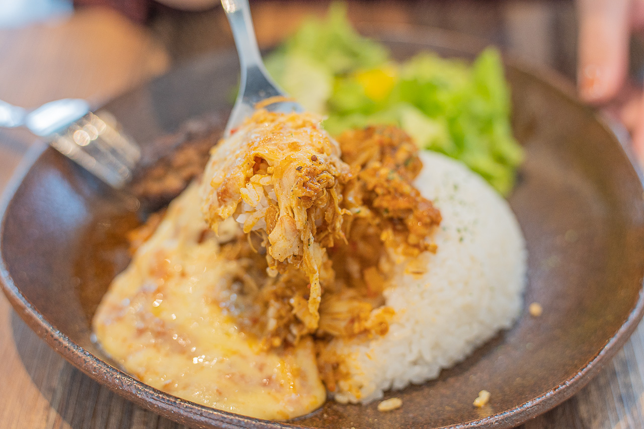치킨 카레에는 햄버거 스테이크와 치즈를 추가 했습니다. 방문한날에 다행히 햄버그 스테이크의 재고가 있었습니다. 치즈는 자리에 앉아 있으면 즉석 해서 부어 주는데 꽤 비주얼이 괜찮습니다. 키마 카레에는 반숙 계란이 같이 나오는데 이 녀석을 터뜨리는 비주얼도 사진 찍기 좋습니다.