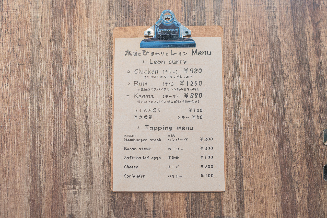후쿠오카 텐진과 가까워서 종종 가게 되는 스미요시 주택가에는 물을 전혀 사용하지 않는 무수분 카레(無水カレー) 전문점이 있습니다. "태양과 해바라기와 레온"이라는 가게로 16종류 스파이스를 사용한 무수분 카레를 제공합니다. 본사는 스푸 카레로도 유명한 홋카이도에 위치해 있습니다. 무수분 카레는 물을 사용하지 않고 야채나 고기의 수분만으로 만드는 카레입니다. 이렇게 만들어진 카레는 야채의 감칠맛이 응축되어 진하고 맛있는 카레가 됩니다. 무수분 카레를 만들 때 포인트는 수분이 많은 채소를 사용하는 것, 평소보다 매운 루를 사용하는 것, 두꺼운 냄비나 압력 냄비 등으로 푹 끓이는 것입니다.
