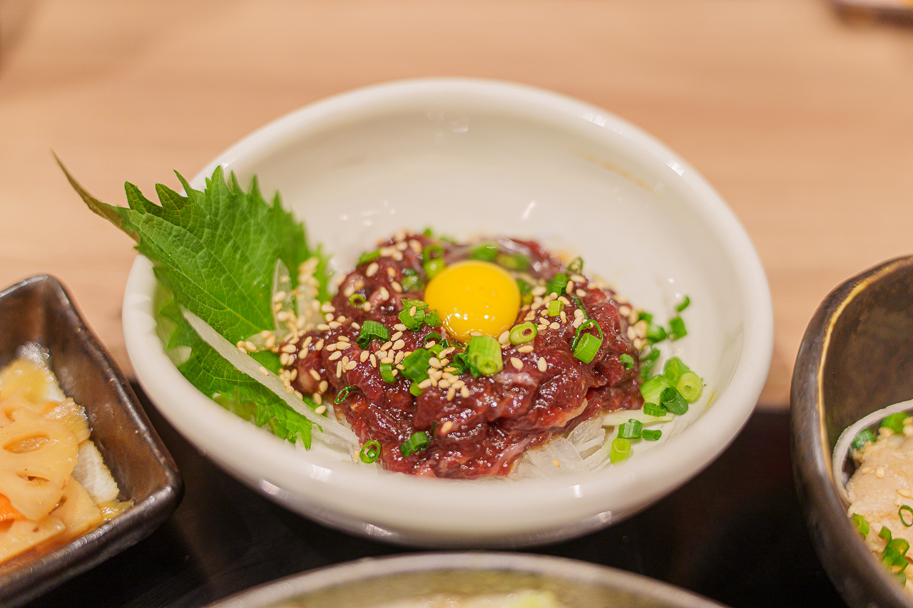 저녁이라 1인 한정 세트가 있어 주문해 보기로 하였습니다. 2,508엔에 3가지의 수프 중에서 선택할 수 있고, 절임 곱창과 육회가 세트로 나온다고 합니다. 쓸데 없이 2인분을 주문하지 않고 저렴하게 먹을 수 있어 정말 다행입니다.
