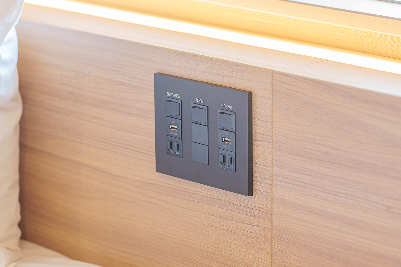 푹신한 침대와 머리맡에는 휴대폰을 충전할 수 있는 플러그가 있습니다