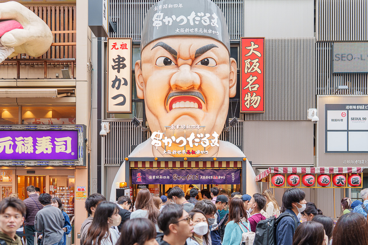 쿠시카츠 다루마는 오사카의 명물 요리인 쿠시카츠를 제공하는 레스토랑 체인. 쿠시카츠란 돼지고기와 야채 등을 잘게 썰어 꼬치에 꽂고 빵가루를 묻혀서 튀긴 것으로 소스와 소금으로 양념한다. 쿠시카츠 달마에서는 다양한 종류의 쿠시카츠를 즐길 수 있다. 치즈, 새우, 간, 소힘줄등이다. 쿠시카츠 다루마는 화내고 있는 사장님의 캐릭터를 바탕으로 오사카 전역에서 만날 수 있는 쿠시카츠 맛집. 난바에서는 너무 줄이 길어서 영상에서는 비추했지만 저렴하기도 하고 맛있는 집이다.