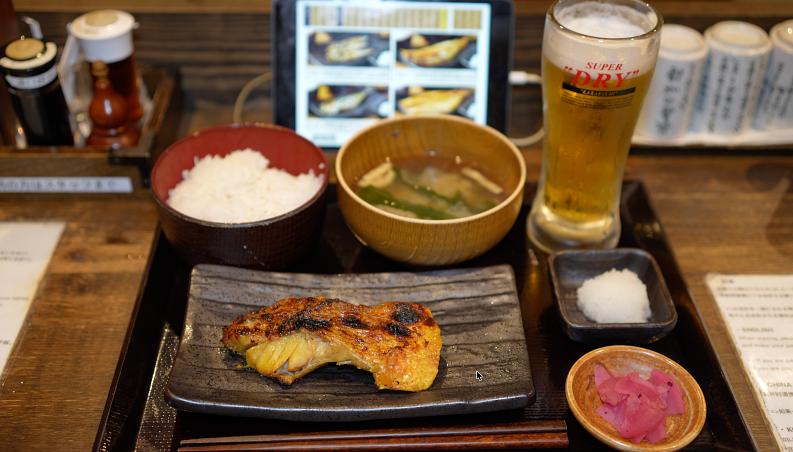 오사카 난바 난카이도오리에서 도톤보리로 향하는 길, 소박한 외관의 생선 정식집이 눈에 띈다. 이곳에서는 176엔이라는 파격적인 가격의 생맥주와 함께 담백한 생선 정식을 즐길 수 있어, 자극적인 오사카 미식 사이에서 잠시 숨을 고르기 좋다. 장문볼락 된장구이 정식은 단단한 살결의 생선에 짭짤한 된장 양념이 어우러져 속을 편안하게 만든다. 아침 7시부터 밤까지 영업해 시간대 상관없이 들르기 좋으며, 오사카 여행 중 하루쯤은 이런 푸근한 한 끼가 잘 어울린다.