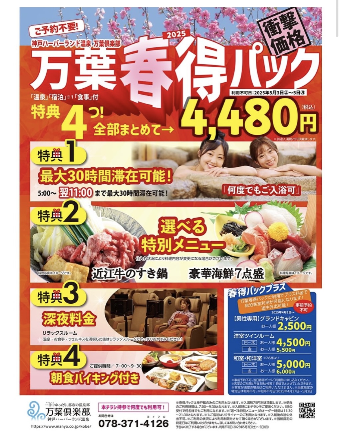 위의 광고를 다운로드 해서 가져가야 영상에서 소개한 내용처럼 1박 2식 침대 없이 수면실에서 숙면 = 4,480엔으로 이용 가능하다. 오사카 간사이공항에서 베이셔틀(배)로 30분거리 아룸다운 항구도시 고베.고베역 부근 항구근처에 위치하는 고베 명물 하바랜드 야경이 끝내주는 고베하바란드 온천 만요노유. 24시간 영업 연중무휴, 온천, 족욕탕, 식당, 사우나, 암반욕 영화관까지 갖여줘있는 대단한 시설. 당일이용 숙박도 가능해서 좋다. 빈손으로 온천욕을 즐길 수 있어 여행 일정중에도 부담 없이 들를 수 있다.