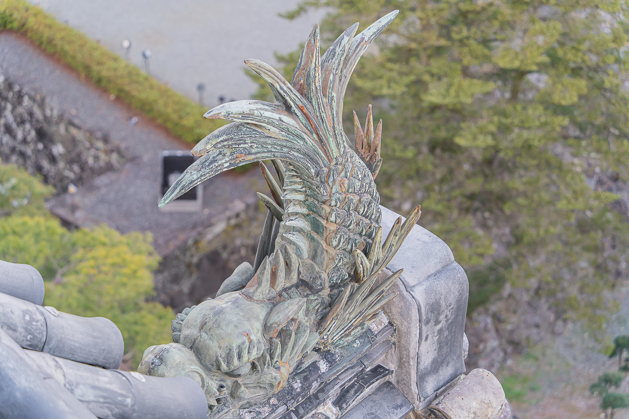 일본의 천수각에서 자주 볼 수 있는 "샤치"도 볼 수 있습니다.