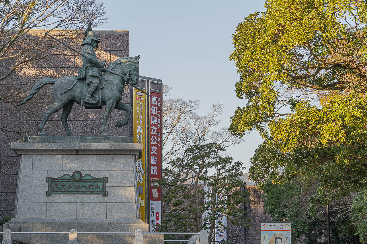 성 입구에 늠름하게 세워져 있는 성주 야마우치 가즈토요의 동상이 보입니다.