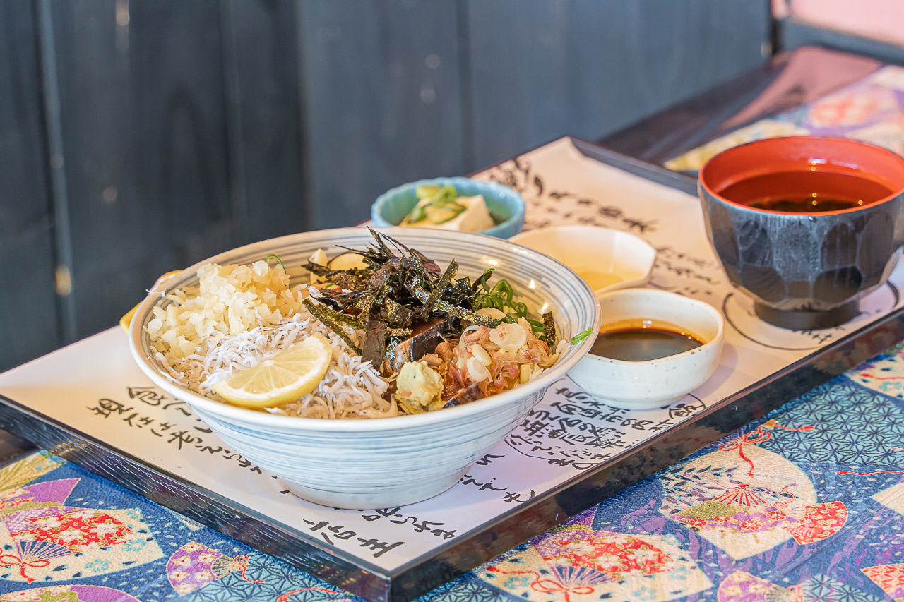 맛있는 가다랑어, 멸치의 반반 덮밥, 오차즈케, 커다란 새우튀김. 마무리로 일본 전통의 오하기까지 맛볼 수 있는 쿠지라노 잇푸쿠.