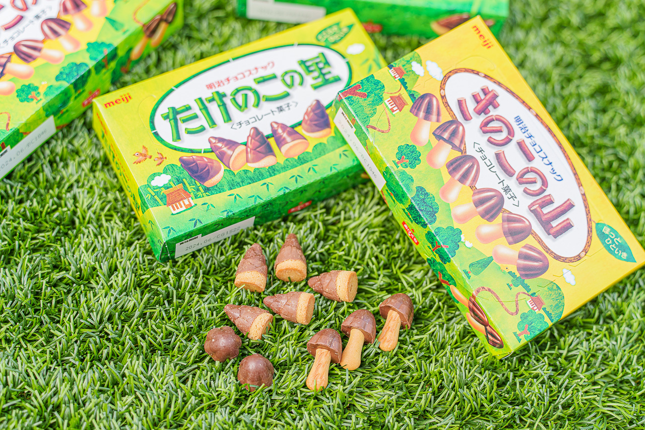 일본에선 아이들이 키노코노야마키노코노야마 파와 타케노코노사토 파가 나뉘어 종종 다투기도 한다고 한다. 한국의 짬뽕 파와 짜장면 파 같은 느낌이다. 키노코노야마 파는 초코가 더 많이 들어가 있어서 좋다고 주장을 하고 타케노코노사토 파는 아래의 줄기 부분이 쿠키로 되어 있어 식감과 맛이 더 좋다는 주장이다. 메이지의 매출 자체는 타케노코노사토가 6:4의 비율로 더 높다고 한다.