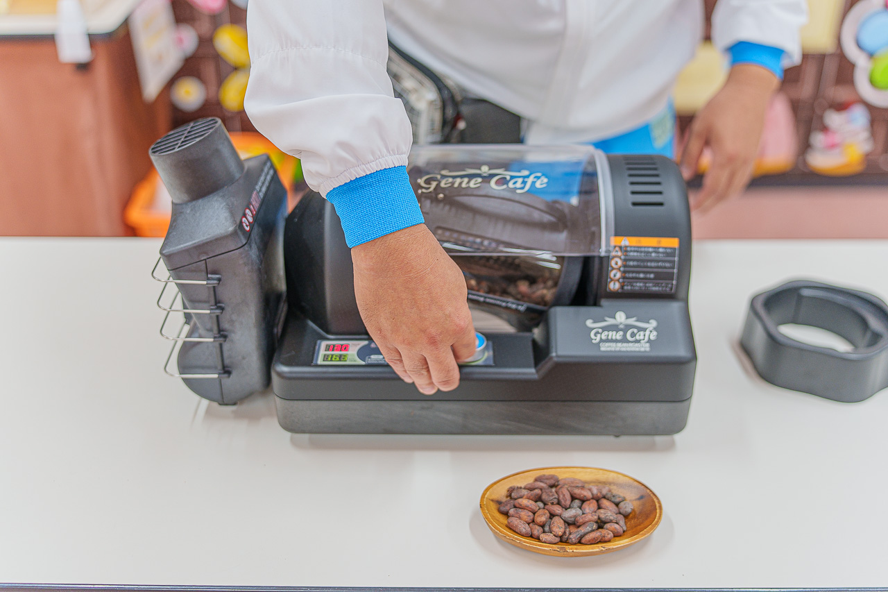 카카오 콩을 일본으로 가져와 세척 및 선별된 카카오 콩을 커피 콩 로스팅과 유사한 과정으로 로스팅한다. 로스팅은 초콜릿의 맛과 향을 더욱 깊게 만들어 준다. 구체적인 로스팅 시간과 온도는 기업 비밀. 로스팅 후에는 원두가 더욱 부서지기 쉽고, 겉 껍질도 제거하기 쉬워진다. 로스팅한 원두는 껍질을 깨뜨려 겉 껍질(껍질)과 속껍질(카카오콩의 식용 가능한 부분)을 분리한다. 이 과정을 키질(winnowing)이라고 한다.