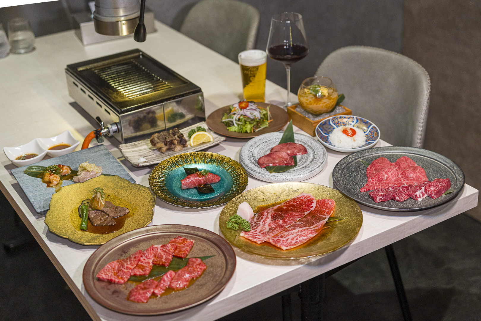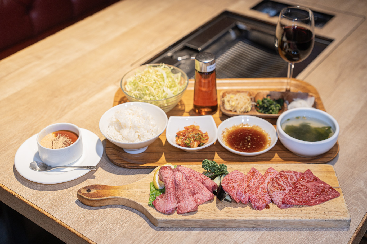 텐진 솔라리아 플라자에 위치한 야키니쿠 하치하치는 쇼핑 중 가볍게 들르기 좋은 흑털와규 전문점이다. 연기와 냄새가 거의 없어 일반 레스토랑처럼 쾌적한 환경에서 식사를 즐길 수 있다. 프리미엄 런치(3,828엔)는 우설을 시작으로 산카쿠, 카이노미, 신신, 자부톤 등 희소 부위를 한 점씩 제공해 부위별 차이를 비교하며 맛볼 수 있는 구성이 특징이다. 샐러드와 나물, 스프까지 포함되어 부담 없이 즐길 수 있어, 텐진에서 간편하게 와규를 경험하기에 적합하다.