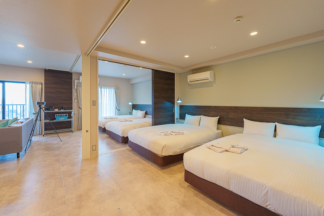 후쿠오카 지하철역에서 도보 5분, 넓은 공간과 다양한 비품이 인상적인 ‘호텔 소 스미요시’. 무인 체크인과 최신 전자기기, 다이슨 드라이기까지 갖춘 에어비엔비 스타일 숙소. 더블 침대 4대 구성으로 여러 명이 묵어도 금액 변화 적고, 프로젝터와 싱크대까지 완비. 세탁기와 세제도 구비되어 있어 장기 숙박이나 그룹 여행자에게 특히 추천할 만한 곳.