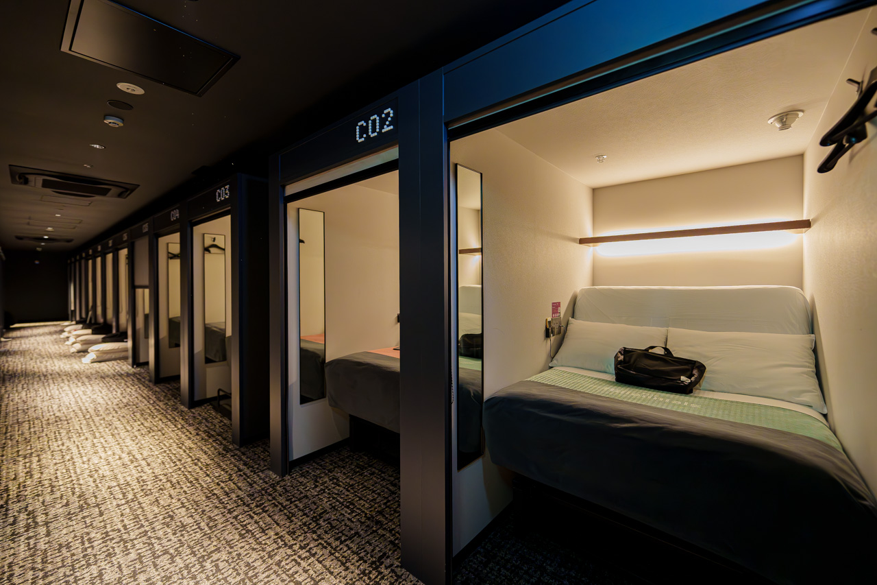 사실 여러번 3분여행 채널에서 소개한 캡슐 호텔. 나카스카와바타 역에서 도보 1분. 주변에 편의점과 드럭스토어, 각종 식당과 새벽까지 하는 음식점들이 있어 위치는 정말 어마어마하게 좋은 곳. 아참 이치란과 돈키호테도 도보 1분이면 갈 수 있다. 캡슐 호텔이라고는 하지만 개미굴 같은 계단을 올라가야 하는 캡슐이 아닌 넓찍한 리클라이닝까지 가능한 침대, 슬라이드를 닫으면 좁지만 옷도 갈아 입을 수 있는 전용 스페이스, 침대 아래엔 짐 보관 스페이스, 세이프티 박스까지 갖춰져 있어 혼여라면 도전해 볼만한 곳. 특히 공용 스페이스가 엄청나게 잘 되어 있어 1층의 바에선 17시 30분부터 18시 30분까지 맥주와 사워가 무한리필로 제공되고 2층의 라운지에서는 24시간 커피와 작업 스페이스, 전원을 제공하고 있어 여행 노마드족들이나 비지니스에도 딱이다.