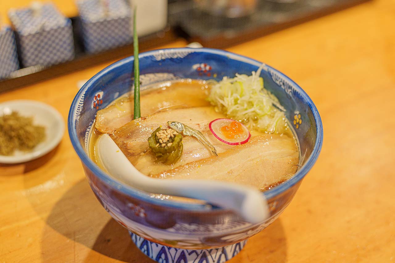 아카사카미츠케 역에서 도보5분. 이 라멘을 먹으러 일부로 아카사카미츠케 역을 온다는 사람도 있을 정도로 유명한 가게. 빗으로 면을 빗어주는 퍼포먼스가 재미있는 가게다. 가게의 특징은 투명한 돈코츠 국물로 뿌옇지 않는 국물이 특징이다. 거기에 라멘에 따라서 멸치 다시를 첨가하여 감칠맛을 더하는 등 돼지의 진한 육수와 멸치의 고소한 다시를 동시에 맛볼 수 있다. 토핑으로는 올리브유와 멸치가루 해초가 나오는데 도중에 이것들을 넣어 먹으면 맛의 변화를 느끼기 좋다.