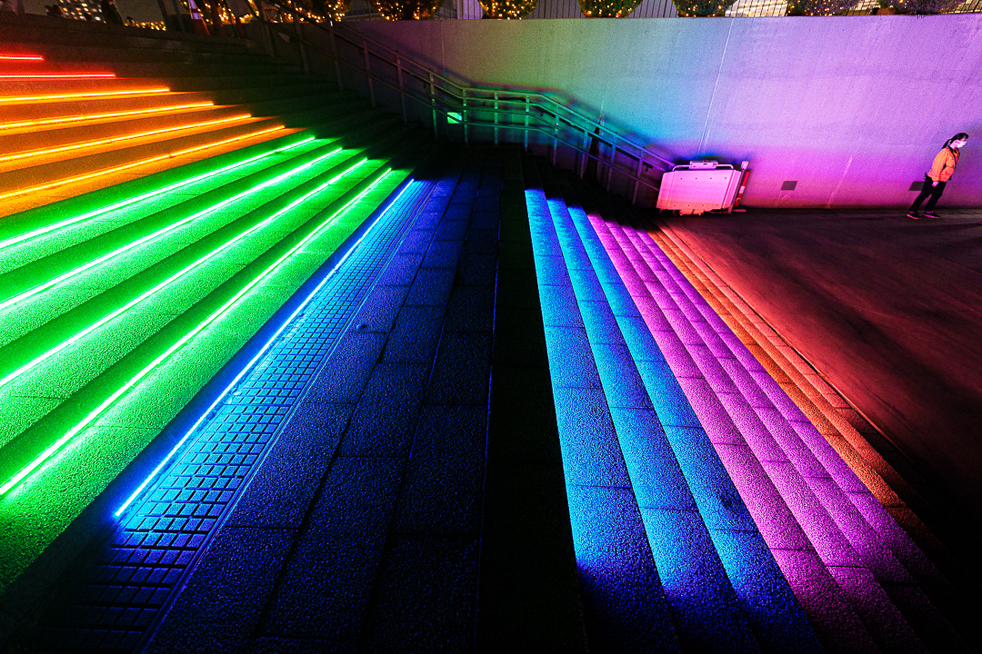 무지개 빛 큰 계단. 레인보우 컬러로 빛나는 계단은 예쁜 채색이 되도록 빛나고 있어 어디서 사진을 찍어도 포토제닉한 사진을 찍을 수 있다. 눈부신 빛을 배경을 삼아 다양한 포즈로 사진을 찍기 좋다.