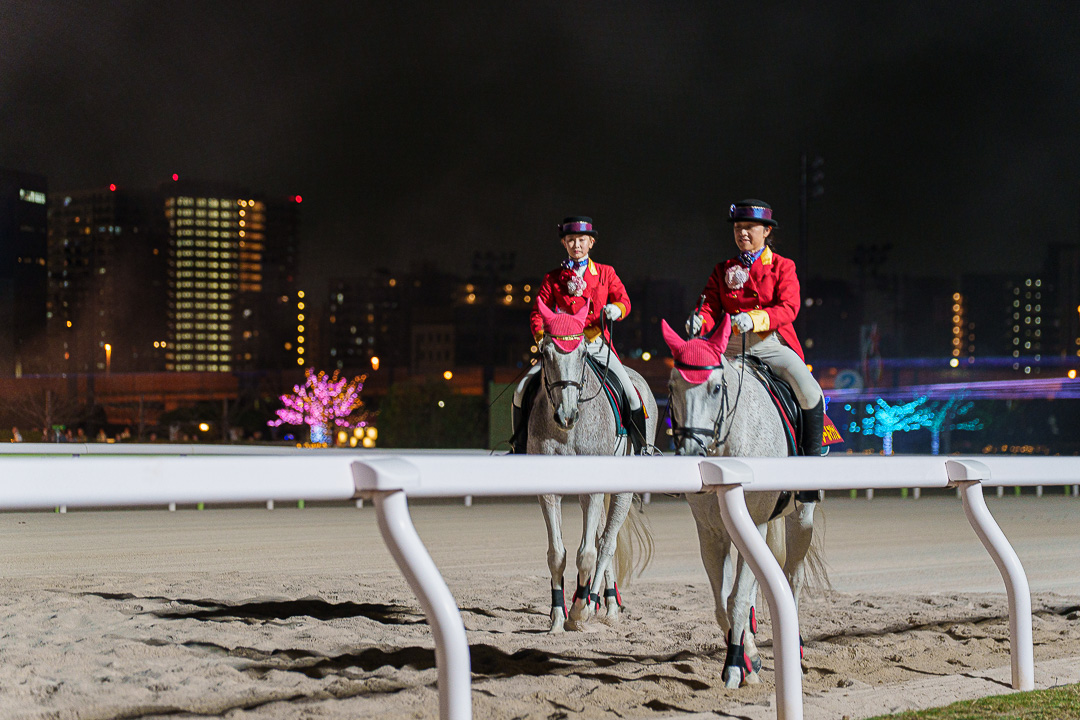 도쿄 메가 일루미네이션에서 가장 볼만한 쇼인 "분수쇼와 유도말 쇼". 백마를 탄 기수들이 경마장을 늠름히 걸어다니고 그 광경을 보며 사진을 찍고 있으면 뒤쪽의 레이저 포인트가 반짝이고 분수쇼가 시작된다. 흥겨운 노래가 나오며 사진 찍기 좋은 포토타임을 가질 수 있다.