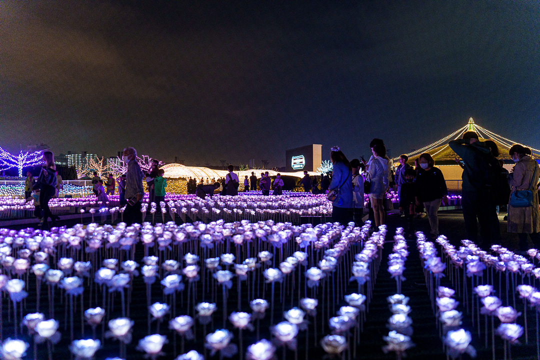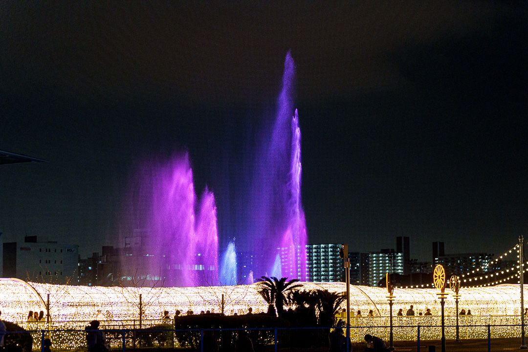 에도(江戸)벚꽃터널이라고 불리는 빛의 터널. 일본이라면 떠오르는 벚꽃을 빛으로 재현했다. 터널의 전등 한구 한구가 벚꽃잎 모양으로 되어 있어 가장 화려한 곳이지만 그만큼 사람이 많이 몰려 사진 찍기 힘들었던 곳이다. 100미터에 달하는 이곳은 핑크색감이 도는 불빛으로 일본에서 가장 해보고 싶은 체험인 벚꽃놀이를 연상시키게 해 준다. 에도 벚꽃터널 뒤쪽으로는 위에서 봤던 분수쇼가 펼쳐지는데 이것도 꽤 볼만하다.
