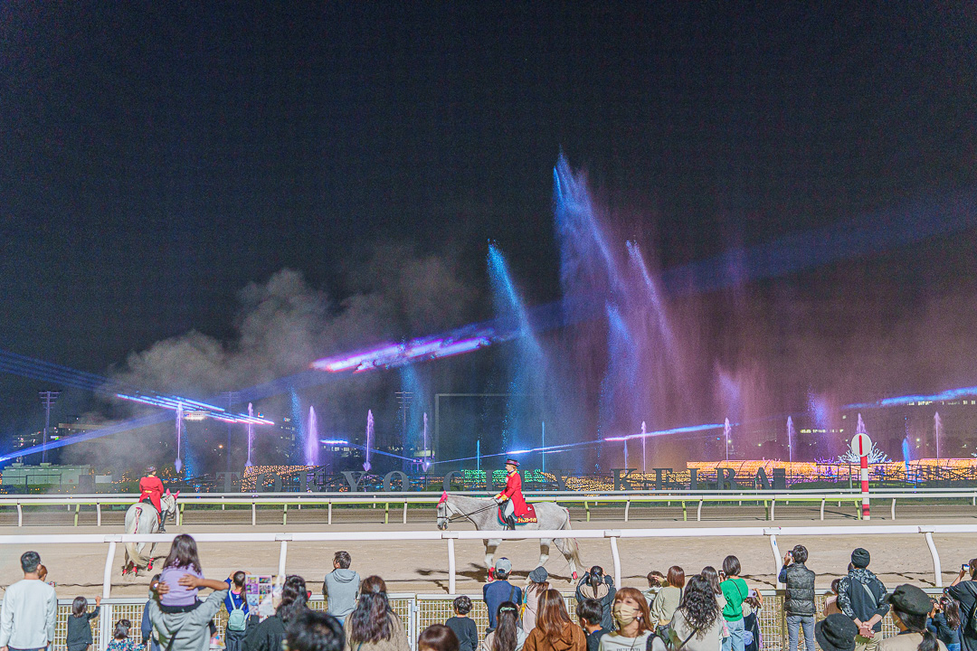 도쿄 메가 일루미네이션에서 가장 볼만한 쇼인 "분수쇼와 유도말 쇼". 백마를 탄 기수들이 경마장을 늠름히 걸어다니고 그 광경을 보며 사진을 찍고 있으면 뒤쪽의 레이저 포인트가 반짝이고 분수쇼가 시작된다. 흥겨운 노래가 나오며 사진 찍기 좋은 포토타임을 가질 수 있다.