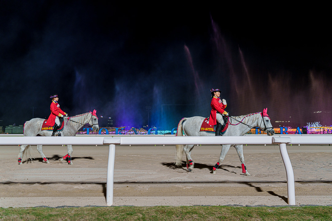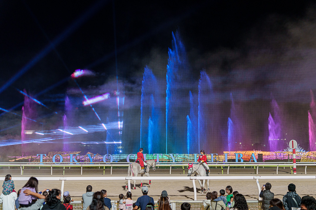 도쿄 메가 일루미네이션에서 가장 볼만한 쇼인 "분수쇼와 유도말 쇼". 백마를 탄 기수들이 경마장을 늠름히 걸어다니고 그 광경을 보며 사진을 찍고 있으면 뒤쪽의 레이저 포인트가 반짝이고 분수쇼가 시작된다. 흥겨운 노래가 나오며 사진 찍기 좋은 포토타임을 가질 수 있다.