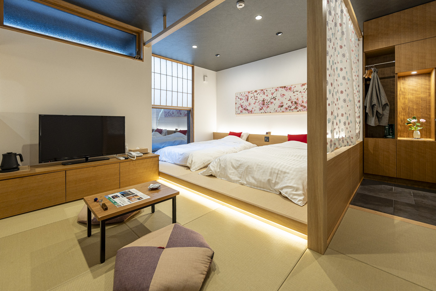 후쿠오카 근교 우레시노 온천에 위치한 최고급 료칸 "와라쿠엔"은 특별한 온천 경험을 제공하는 곳이다. 새로 리뉴얼한 프라티나 스위트에는 아리타 도자기로 만든 욕조가 두 개, 실내 온천탕까지 포함해 프라이빗 온천이 총 세 개 있다. 방은 넓고 고급스러우며, 녹차 입욕제를 사용하는 천연 온천이 있어 이 지역의 특별함을 더한다. 아리타 도자기로 장식된 세련된 인테리어와 다양한 어메니티도 만족스럽다.