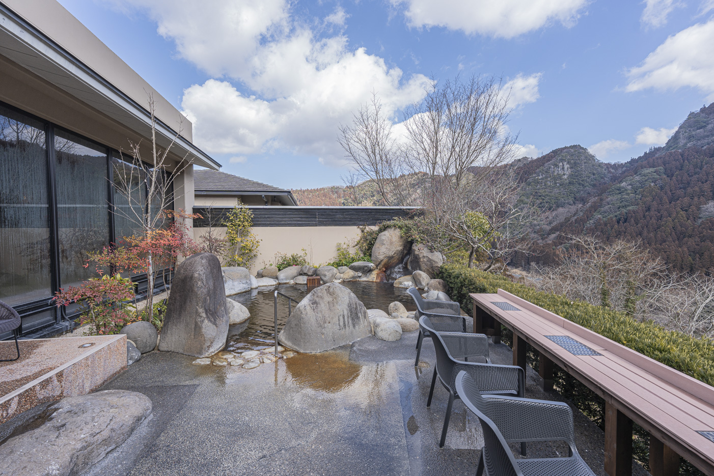 아름다운 산악 경관 속에 자리한 쿠오리테이는 도심에서 벗어나 완벽한 휴식을 선사하는 고급 료칸. 해발 1000미터의 산과 타데하라 습지에 둘러싸여 자연의 소리와 신선한 공기를 만끽할 수 있으며, 모든 객실에는 반 노천탕이 갖춰져 있어 언제든 온천을 즐기며 사계절의 풍경을 감상할 수 있다. 피부 미용에 좋은 탄산수소 온천수는 이곳만의 자랑으로, 진정한 힐링을 체험할 수 있도록 해준다.