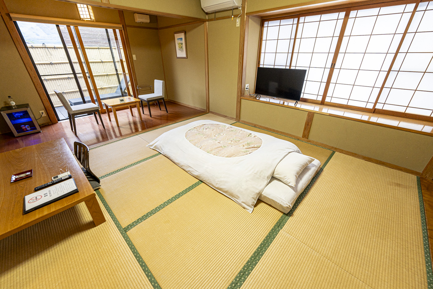 전통 료칸 가격 부담될 땐 유후인 역 근처 이 숨은 숙소가 답. 넓은 방에 전자렌지, 냉장고, 테이블까지 완비—욕실·화장실·세면대 분리라 편리함도 굿. 가족탕 스타일의 개인 온천은 돌아가며 이용 가능하고, 목욕 중 유후다케산 조망은 덤. 슈퍼에서 장 봐서 내맘대로 가이세키 즐기고, 무료 세탁+건조까지! 단, 엘리베이터 없음 주의.