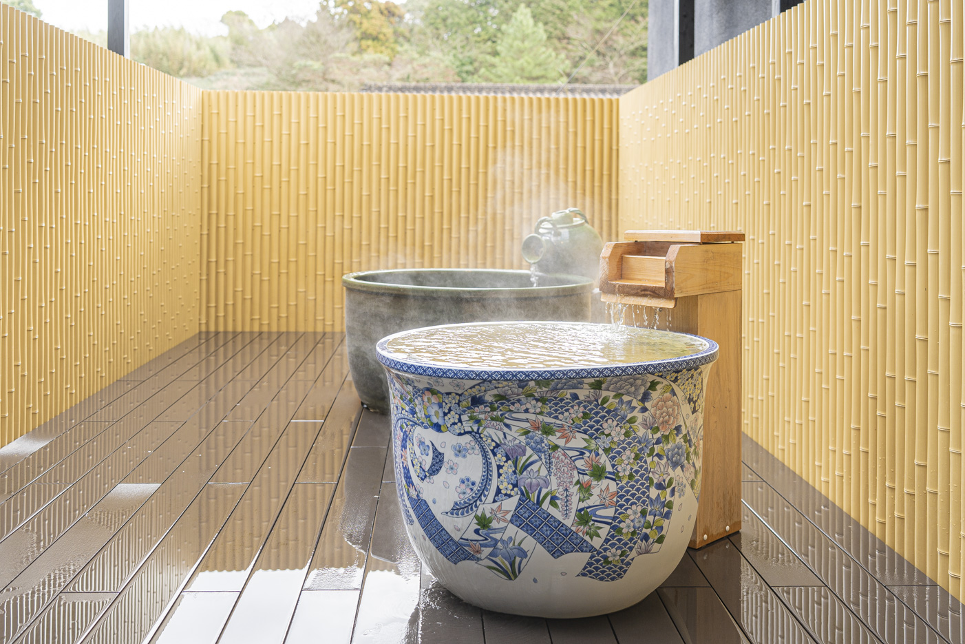 후쿠오카 근교 우레시노 온천에 위치한 최고급 료칸 "와라쿠엔"은 특별한 온천 경험을 제공하는 곳이다. 새로 리뉴얼한 프라티나 스위트에는 아리타 도자기로 만든 욕조가 두 개, 실내 온천탕까지 포함해 프라이빗 온천이 총 세 개 있다. 방은 넓고 고급스러우며, 녹차 입욕제를 사용하는 천연 온천이 있어 이 지역의 특별함을 더한다. 아리타 도자기로 장식된 세련된 인테리어와 다양한 어메니티도 만족스럽다.
