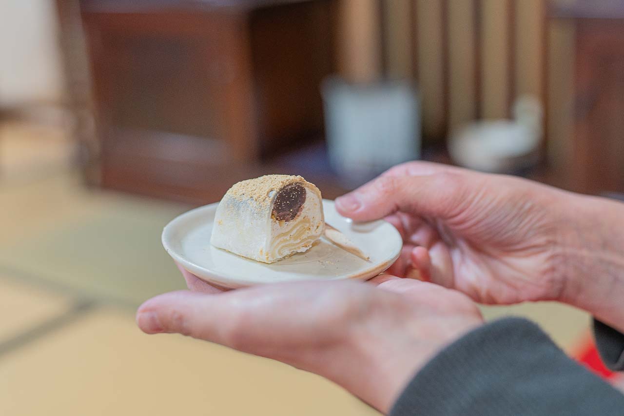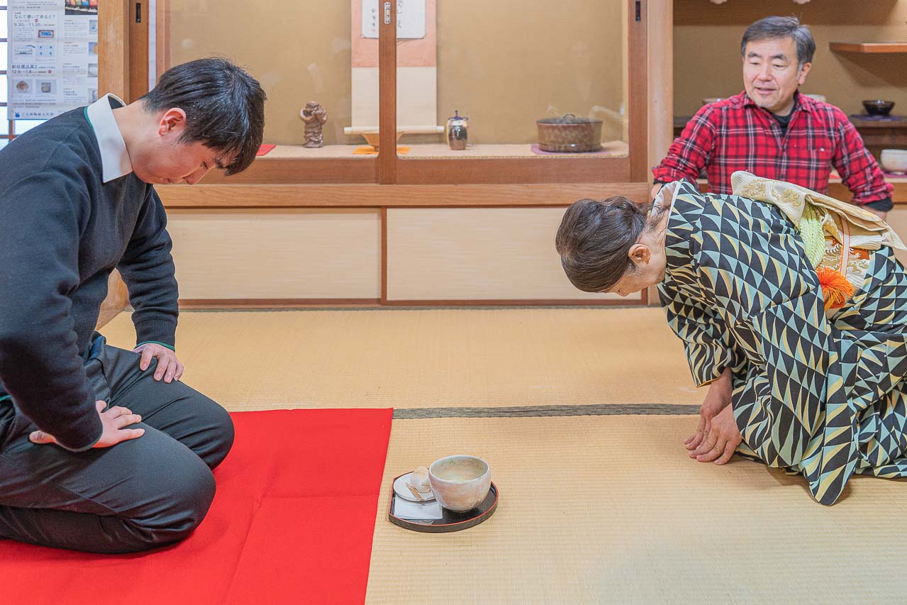 체험이 끝나고 나면 다도 체험도 있어 아가노야키 자기의 아름다움을 만끽할 수 있어 한층 더 충실한 체험이 된다. 다도에서는 도예 기술을 선보일 뿐만 아니라 후쿠치마치의 말차와 다과를 맛보는 특별한 시간을 제공받는다. 인기 있는 후쿠치모치(福智餅)의 다과도 즐거운 분위기를 더해 준다. 두유 크림, 팥소, 호두의 악센트를 부드러운 떡으로 감싸고 콩가루를 입힌 맛의 조합이 다도의 전체적인 분위기를 돋보이게 하는 감각적인 맛을 느끼게 해준다.