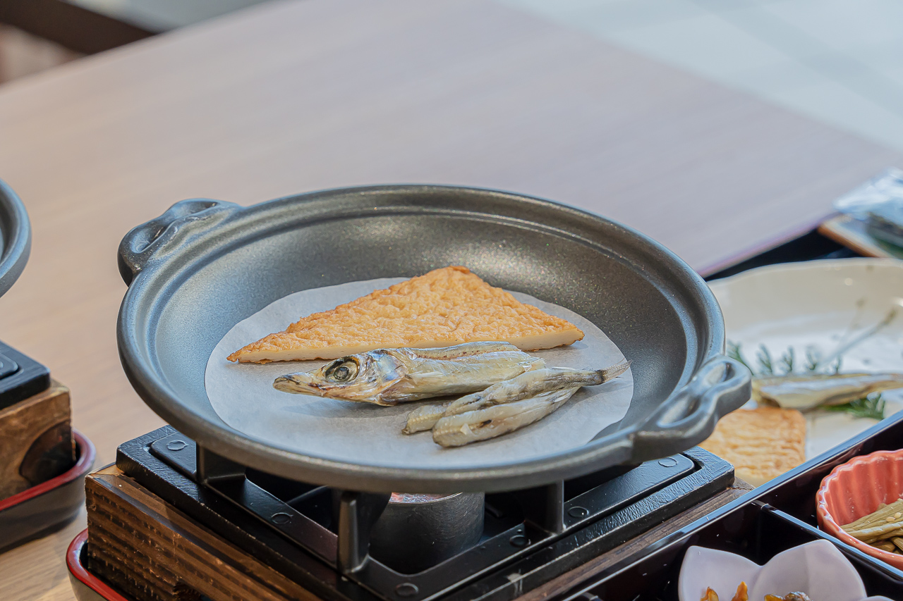 간장을 발라 구운 일본식 , 멸치 볶음, 이름 모를 조림들, 시금치 무침, 온천 계란이라고 불리우는 계란 반숙, 그리고 아침에 마시기 좋은 부드러운 된장국이 나옵니다.
