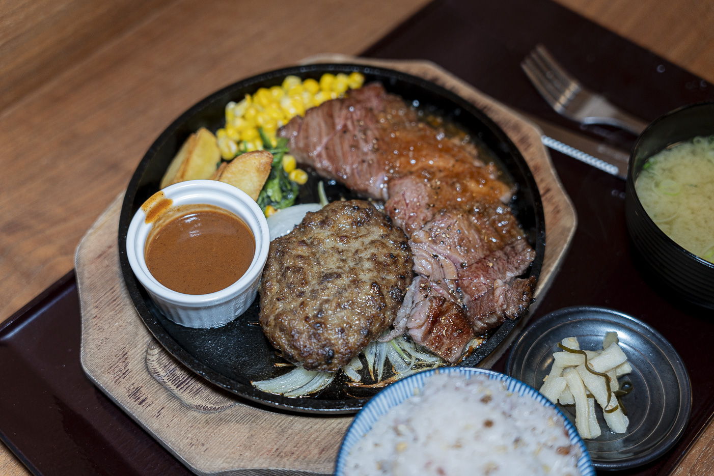 여기서 인생맛집을 찾았다. 레스토랑도 아닌 온천 후 식당에서 먹은 사가규 햄버거 스테이크(170g) + 사가규 로스 스테이크(150g) 콤보. 철판에 지글지글 소리 내며 나온다. 햄버거는 폭신하고 부드럽다. 스테이크는 만족스럽게 씹힌다. 밥이랑 먹으면 끝이다. “온천 식당 퀄리티”가 아니라, 그냥 레스토랑이다.