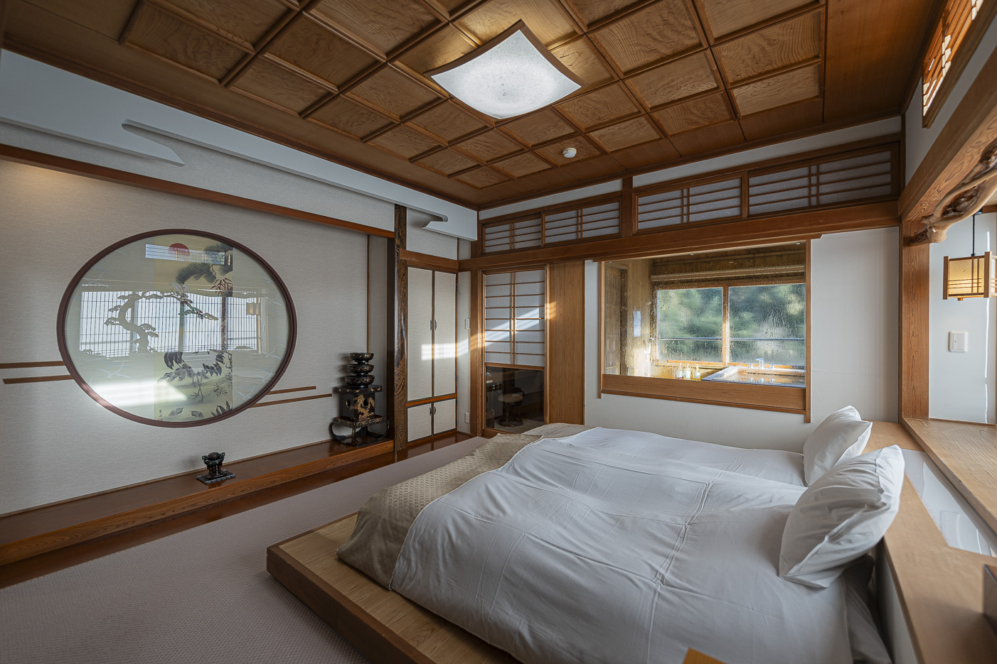 방은 2층 구조였다. 1층은 쉬는 공간과 노천(또는 반노천) 온천이 붙어 있고, 2층은 침실로 분리된다. 침대는 시몬스 트윈(140cm×200cm) 2대 구성으로 안내된다.