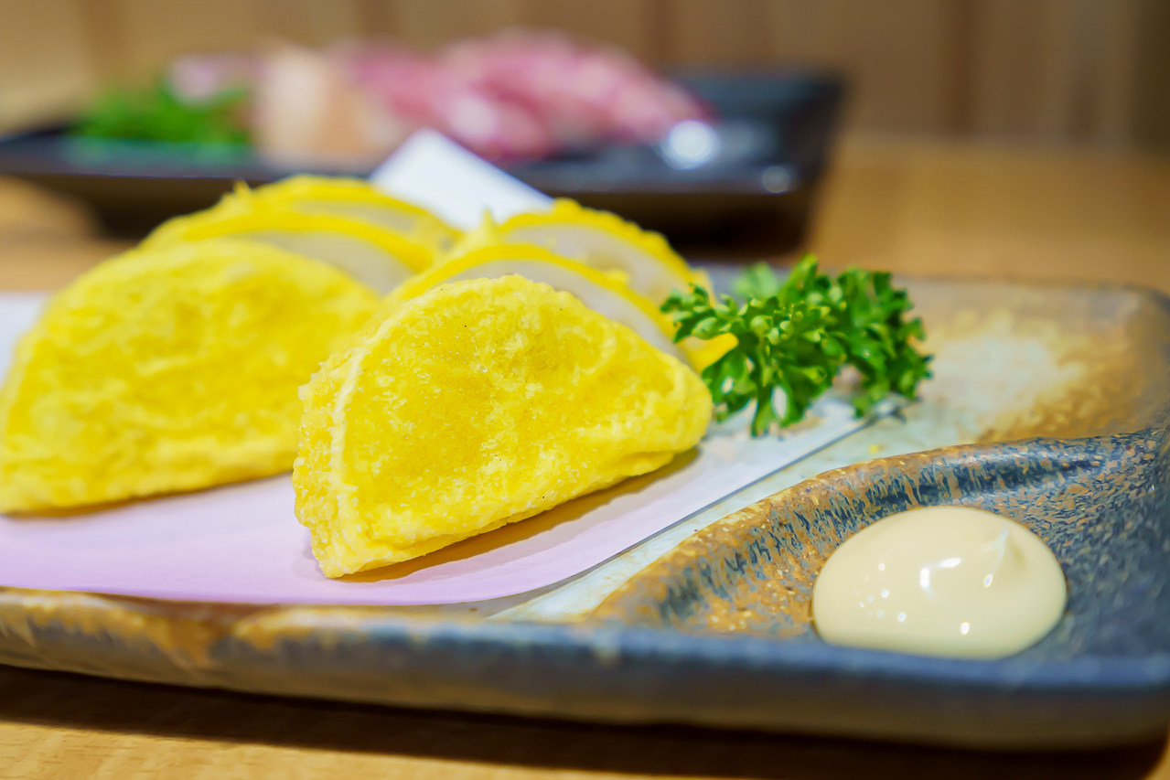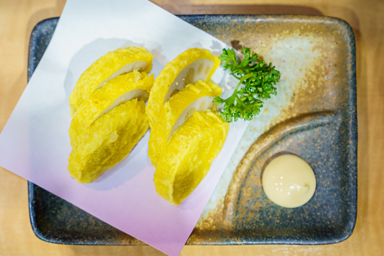 겉은 바삭한 튀김, 안은 연근에 겨자를 꽉 채워 넣은 음식으로 사각사각 거리는 식감과 겨자의 맛이 어우러져 참 맛있습니다.