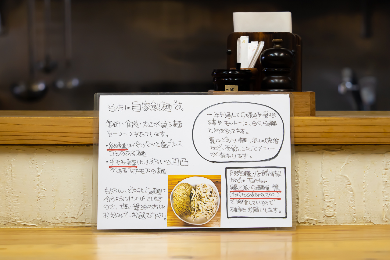 토리토사카나의 면은 전부 수타면으로 칼국수와 같이 울퉁불퉁한 테모미면(수타면)과 일반적으로 라멘에 많이 먹는 호소 멘(얇은 면)이 있었습니다.