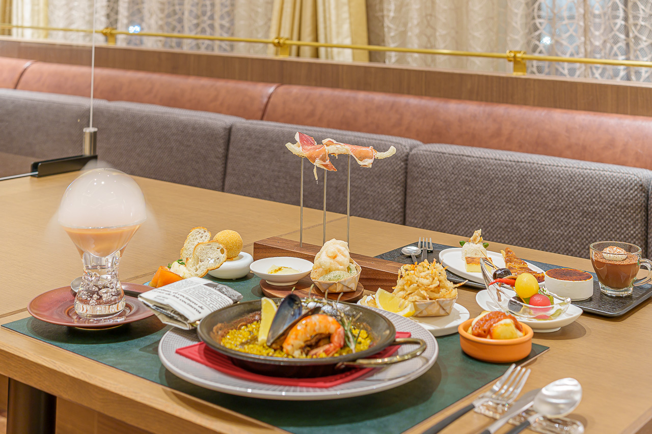 메인 요리는 총 다섯 가지로, 청어와 해산물의 빠에야, 오징어 먹물 빠에야, 소고기 그릴구이, 돼지고기 그릴구이, 생선을 곁들인 해산물 찜이 있었습니다.