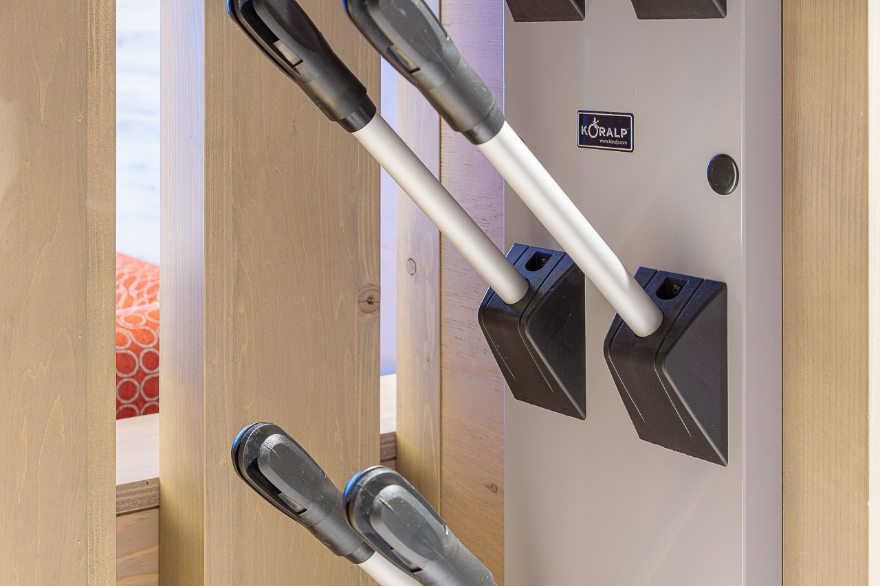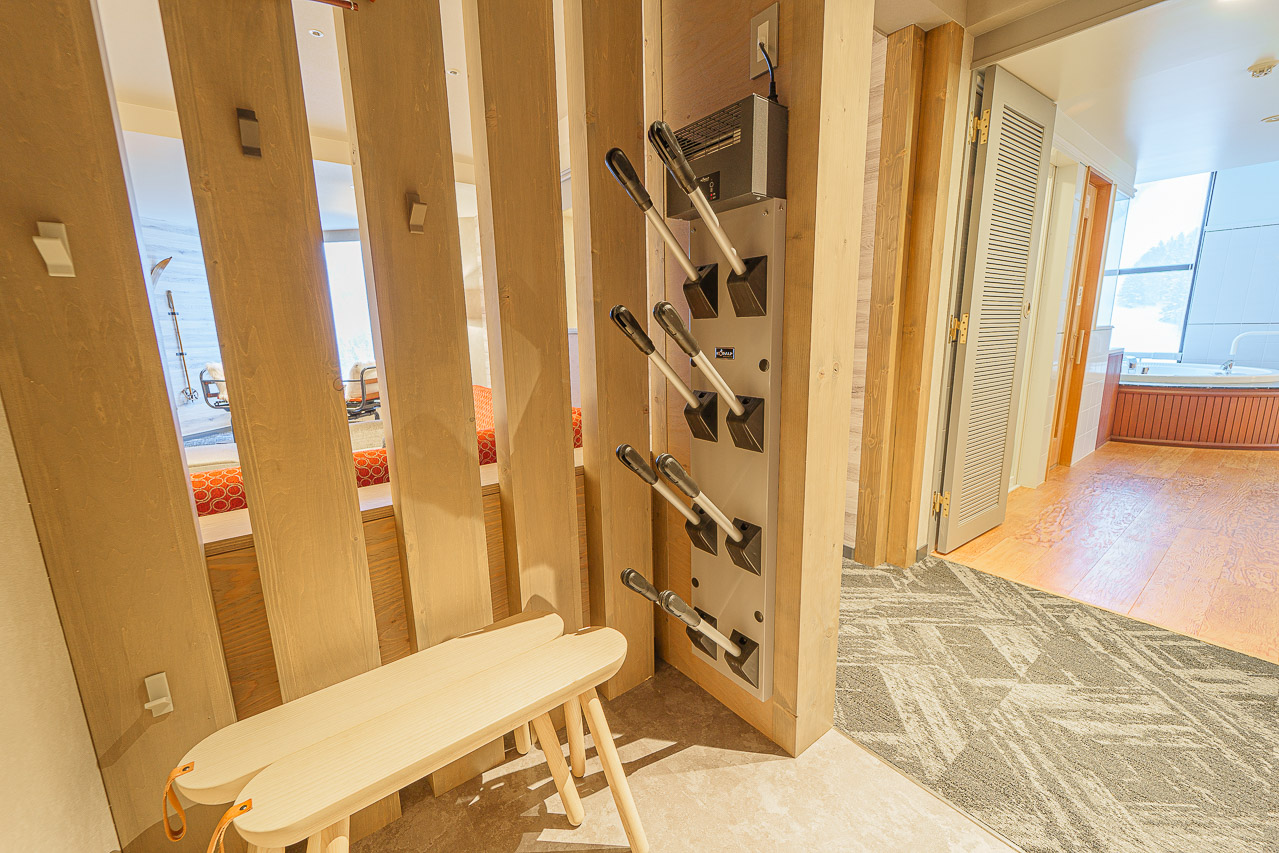 특히 입구에는 장비를 말릴 수 있는 시설이 완비되어 있고 보드를 두거나 옷, 글러브, 헬멧 등을 걸 수 있는 수납이 준비되어 있습니다.