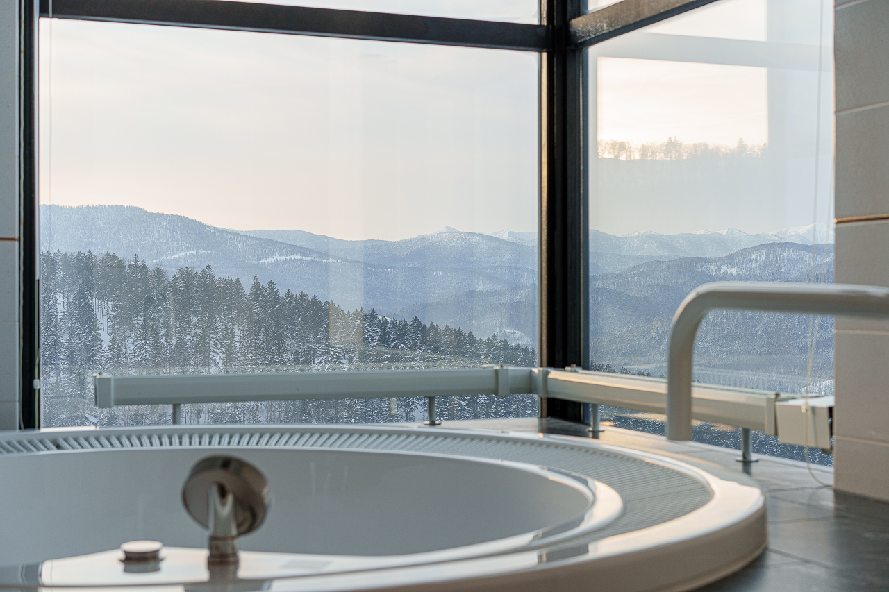 멋진 토마무의 경치를 보며 따뜻한 월풀 욕조에서 사치스러운 아침을 맞이합니다.
