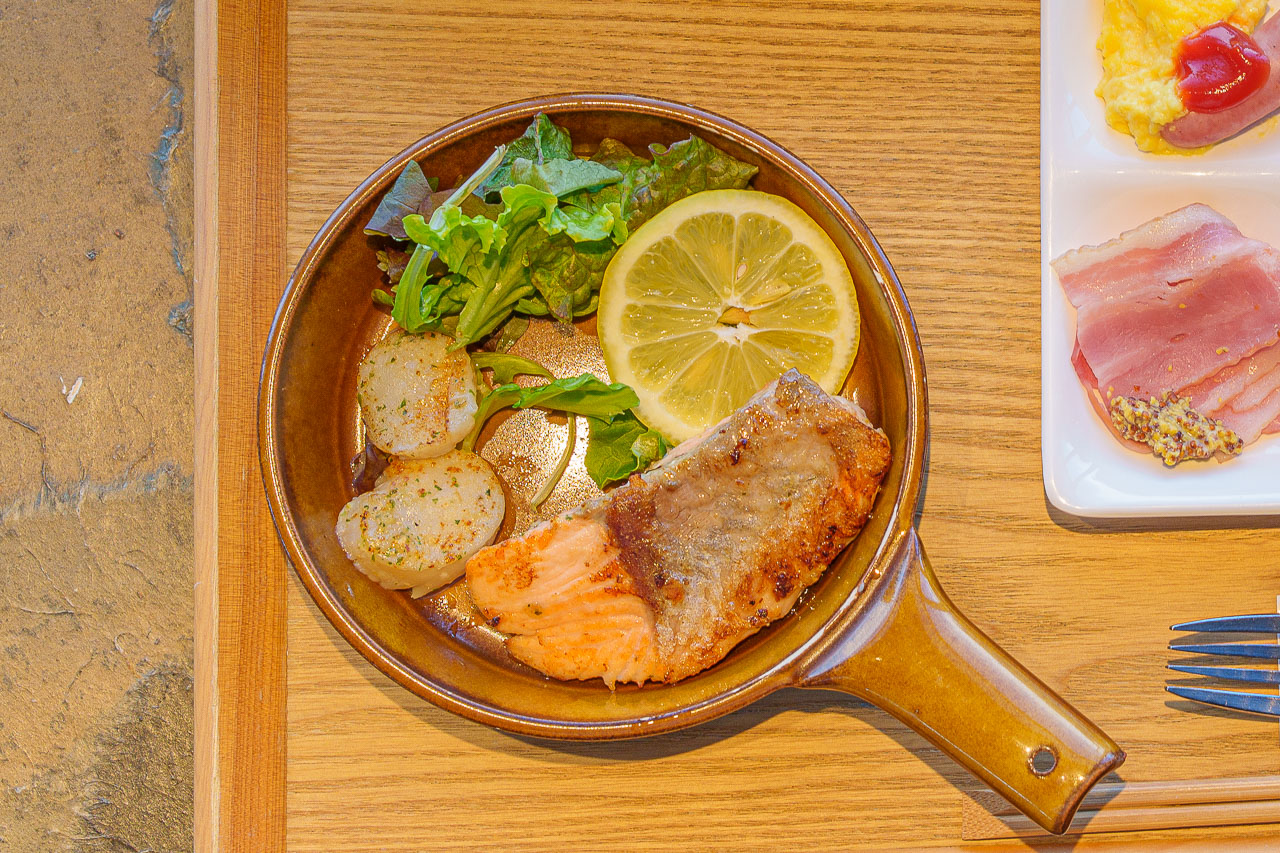 아침이라 3가지 메뉴 중, 연어와 가리비구이를 시켰습니다.