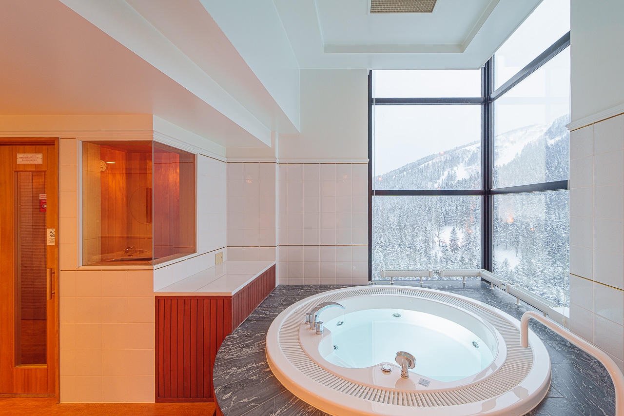 여기서 방금 전 타고 내려왔던 스키 활주로를 내려다보면서 따뜻한 목욕을 즐기고, 또 옆의 사우나에서 몸을 데우고 나면 피로가 말끔히 가십니다.