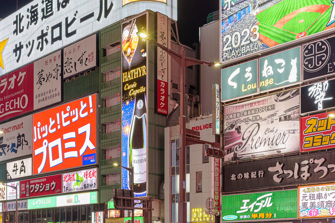 스스키노 역 교차로 주위에는 대형 광고판들이 즐비하며 일본의 주요 맥주 회사들은 여기다 크고 아름다운 광고판들을 운영하고 있습니다.