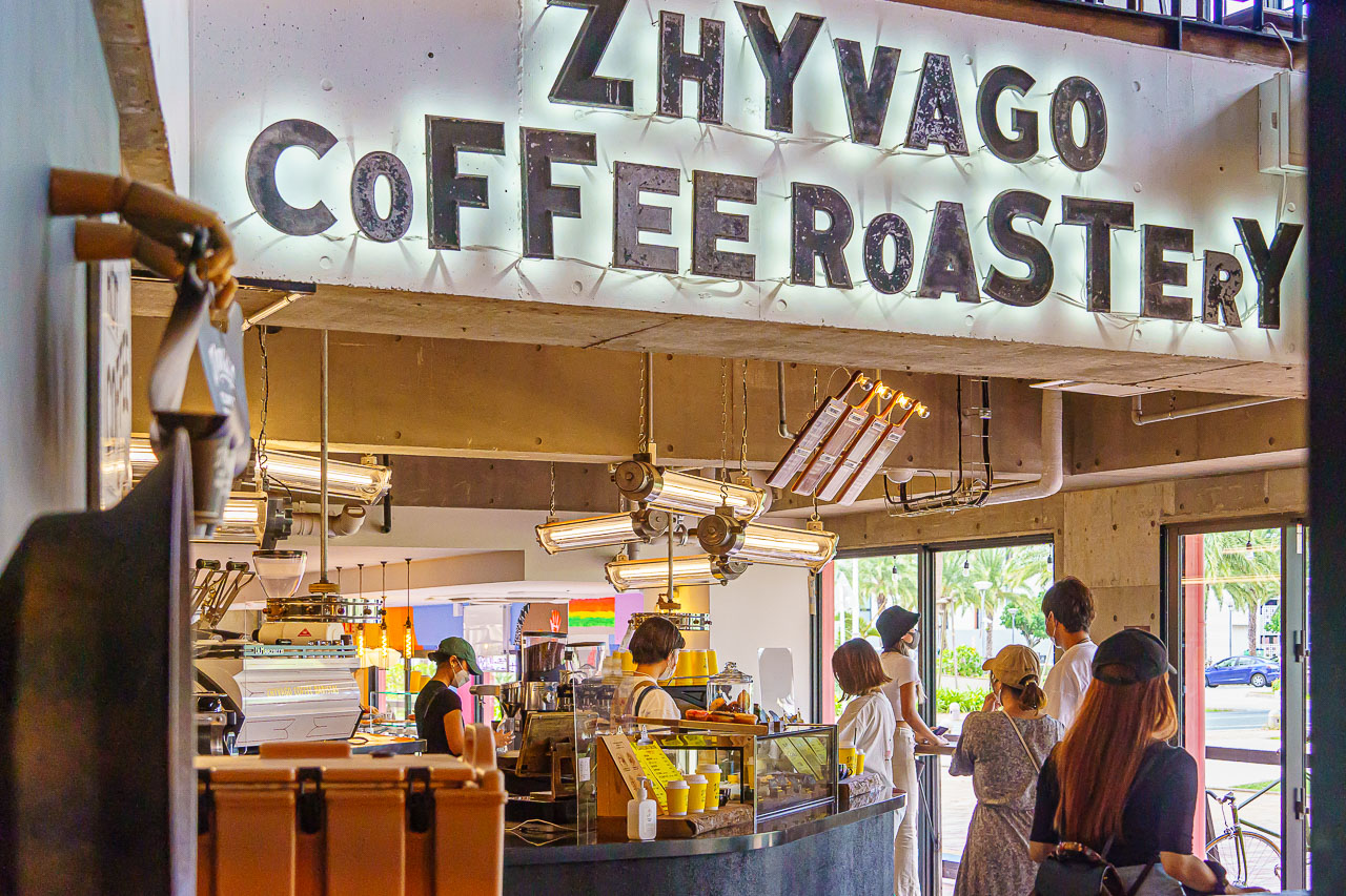 오키나와의 서해안과 미국의 서해안의 느낌을 합친, 하이브리드 공간을 제공하고자 꾸며진 커피 스탠드 "ZHYVAGO COFFEE ROASTERY"