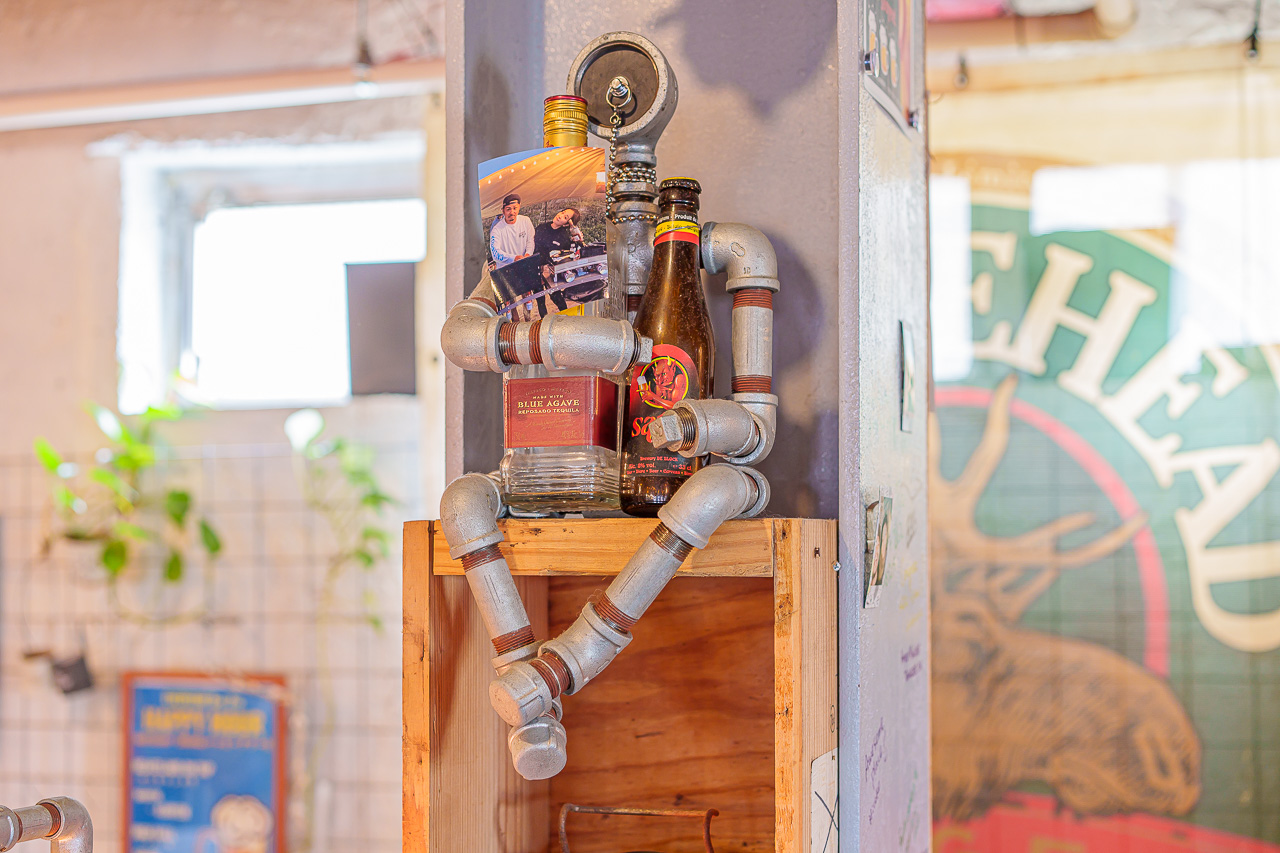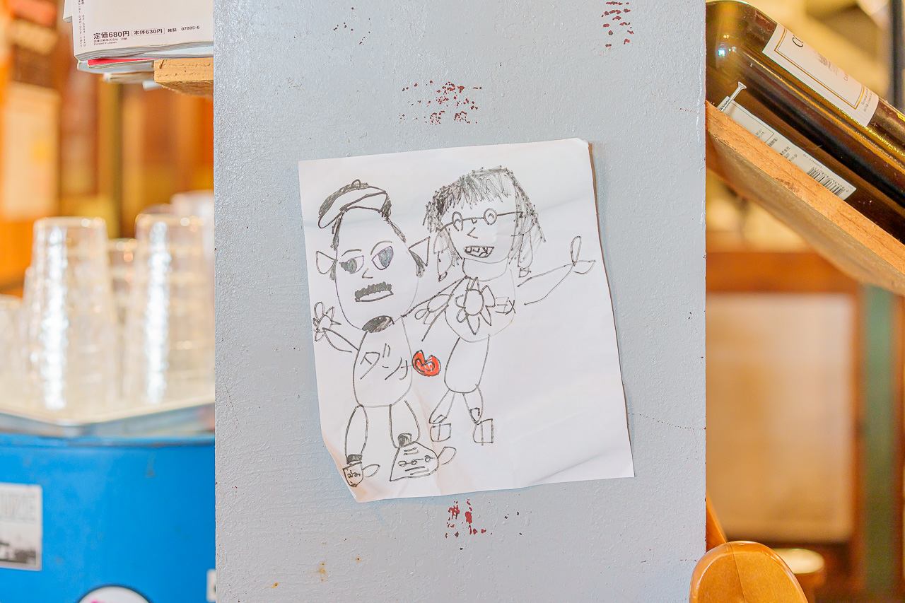 가게의 기둥에 있는 로봇이 뭘 가지고 있나 봤더니 오너 부부의 사진.