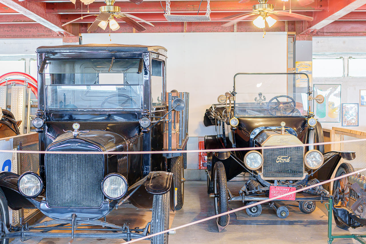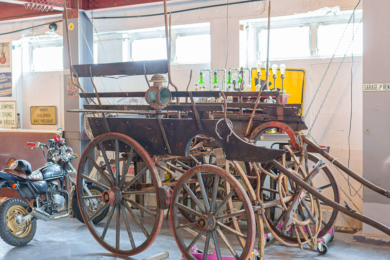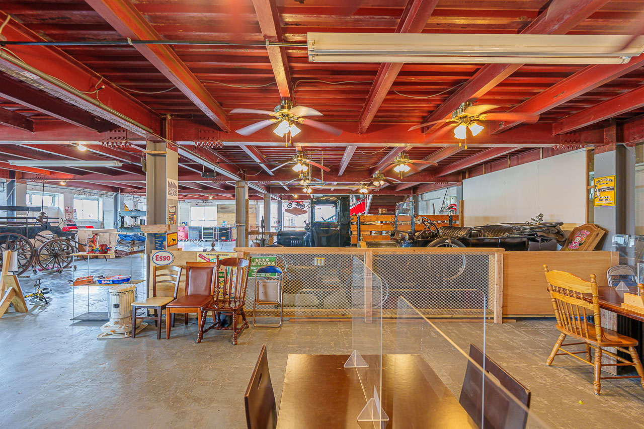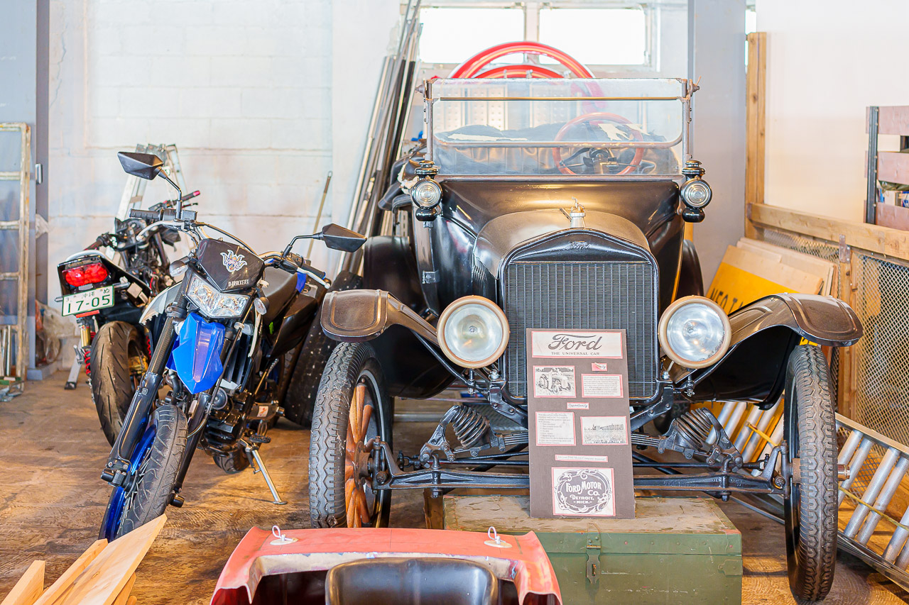 내부는 커다란 네이키드 오토바이와 오래된 자동차가 보입니다.