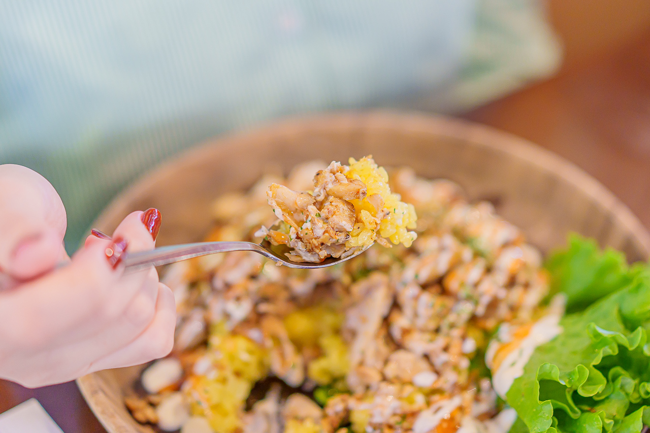약간 강황이 들어간 노란 밥에 그릴로 노릇노릇 구운 닭고기를 잘게 썰어 얹은 요리입니다.