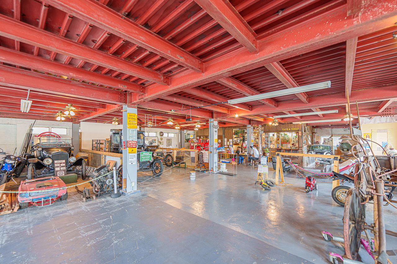 내부는 커다란 네이키드 오토바이와 오래된 자동차가 보입니다.